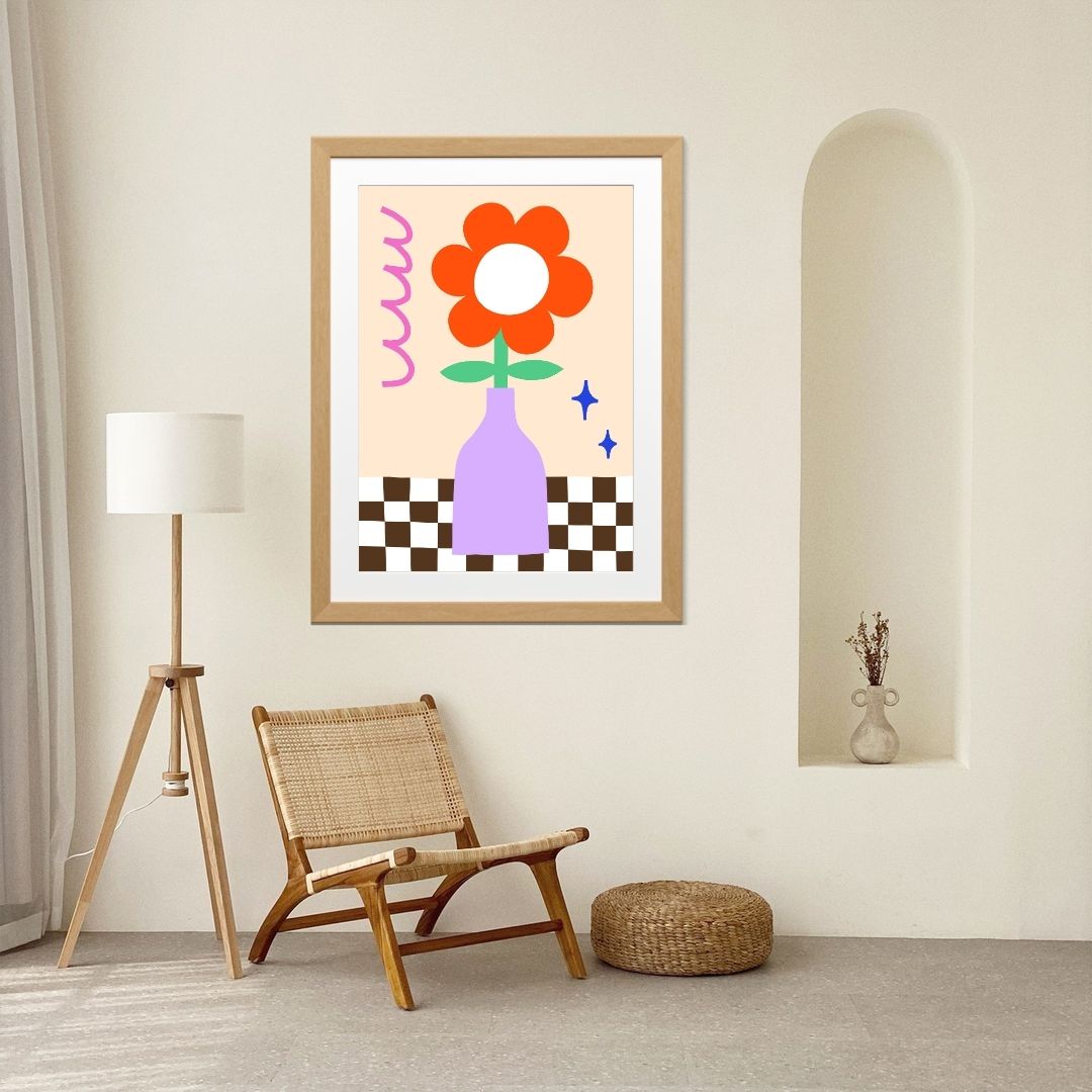 Bring playful charm to your walls with our Retro Bloom Wall Art, a delightful fusion of mid-century design and dopamine decor vibes. Featuring a bold red daisy in a lavender vase, set against a checkered table and whimsical pastel accents, this piece adds instant cheer and character to any room.