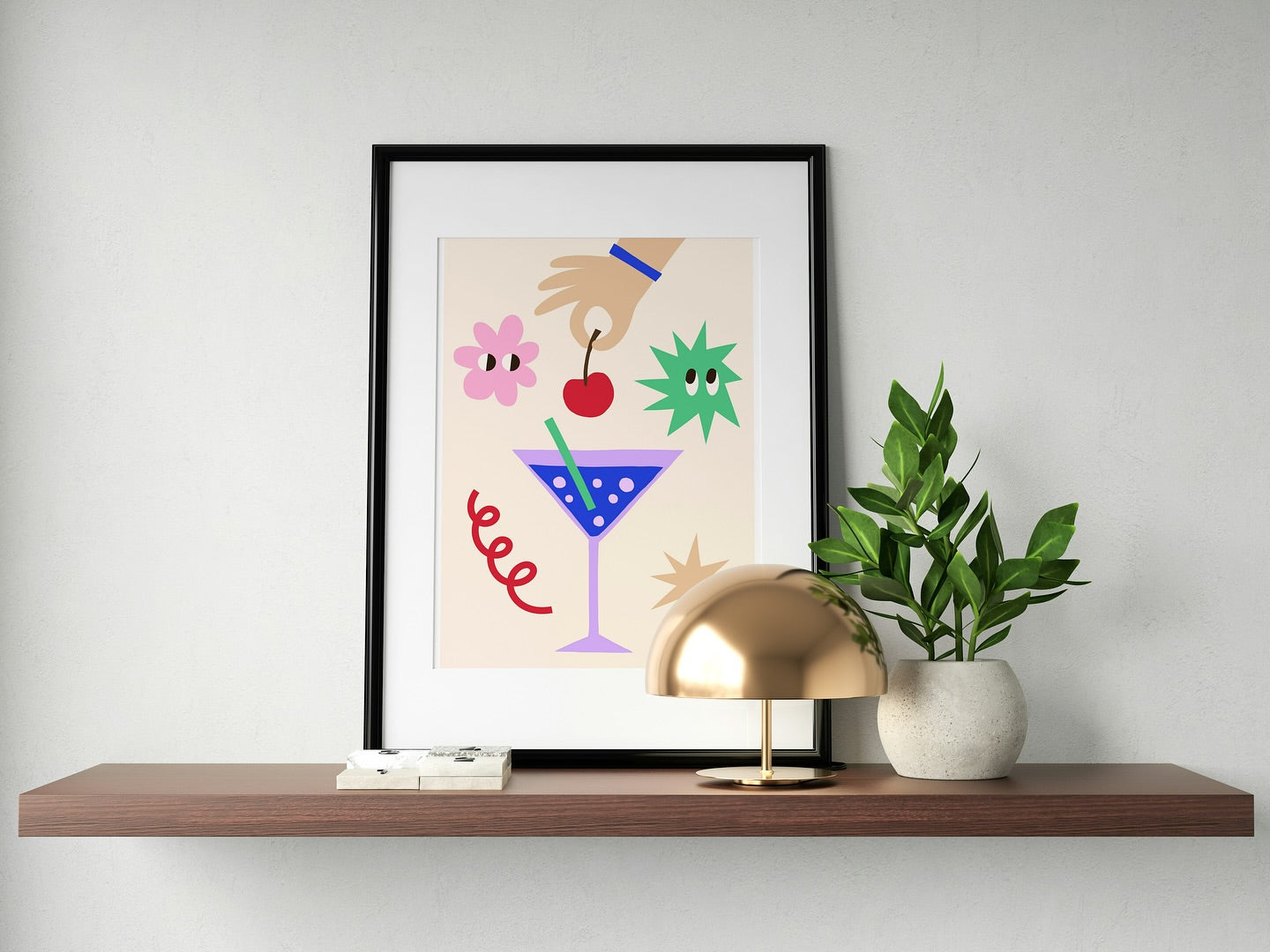 This lively print is your daily reminder to sip, swirl, and sparkle! Featuring a playful martini glass, bold geometric elements, and a hand dropping in the cherry—this piece is bursting with joy and whimsy. The pastel base keeps it chic, while the quirky illustrations bring out the dopamine vibe. Ideal for kitchens, bars, or any wall that needs a mood lift. Framed and fabulous, it’s the perfect mix of art and attitude.